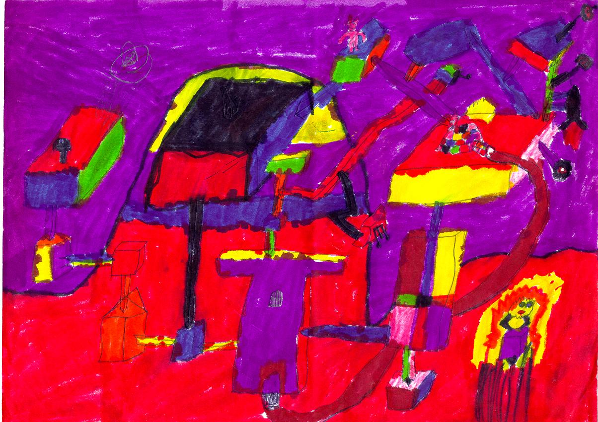 - Early art #3 -- Good lord... Lots of colors. Predominantly red and purple. Looks like a structure of some sort. Maybe.