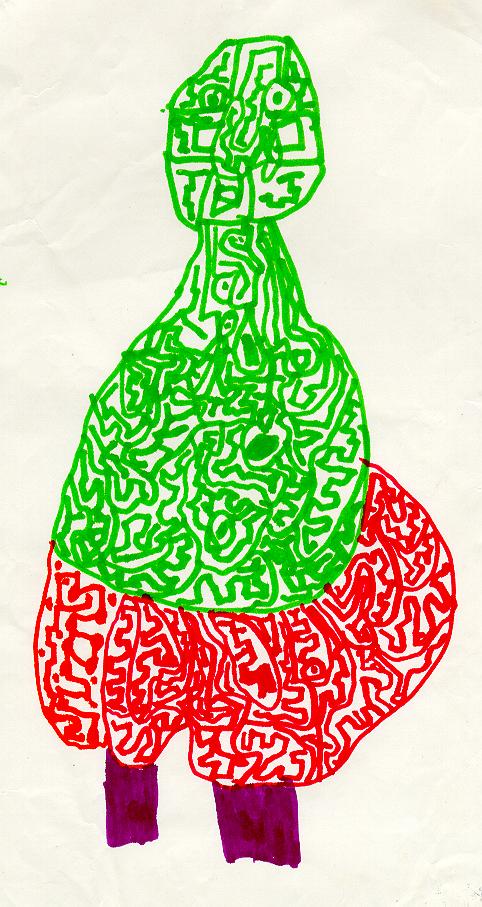 - Early art #2 -- I have no idea how to describe this. It is humanoid, multi-coloured, and appears to have a maze drawn on it. Your guess is as good as mine -- probably better.