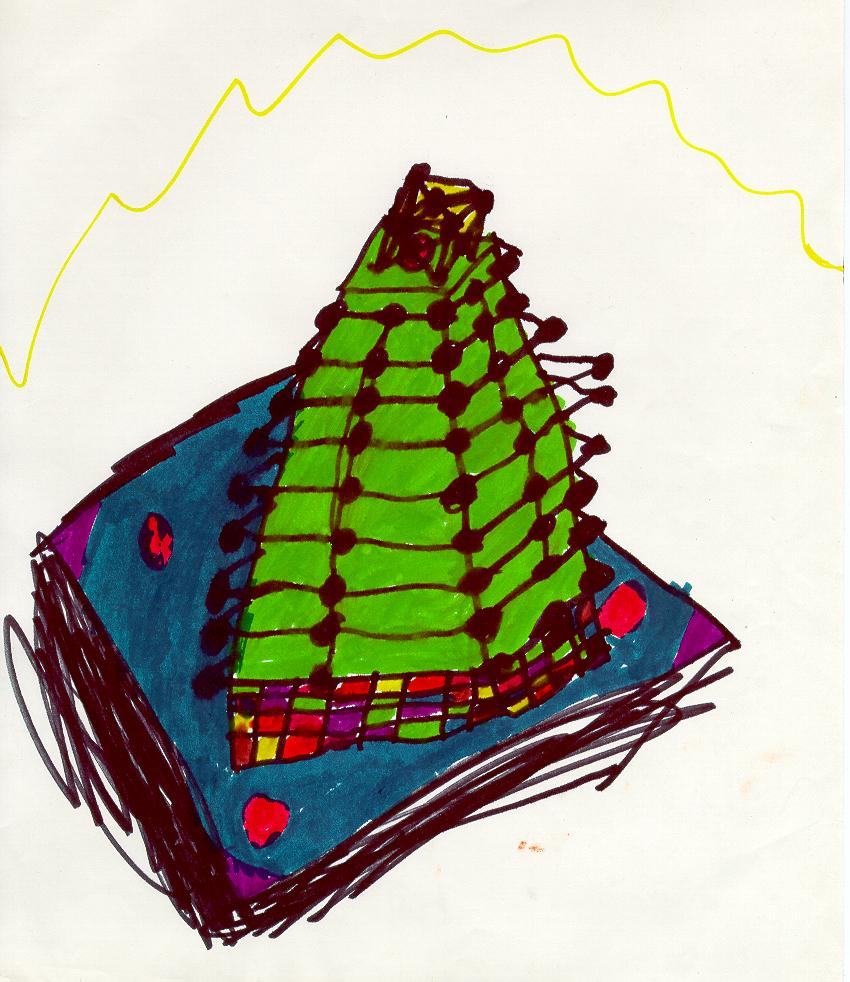 - Early art -- An example of my early artwork. This appears to be a drawing of a green pyramid that has had a net thrown over it. Or something. Damned if I know -- I just drew it. Created prior to 5th grade.