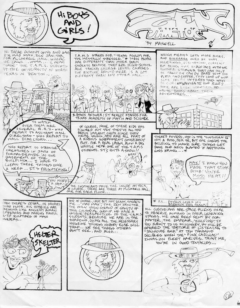 - Zen Janitor -- One of the episodes of Zen Janitor, a comic that Max drew and posted all over the dorm. Destined to be a collector's item someday.