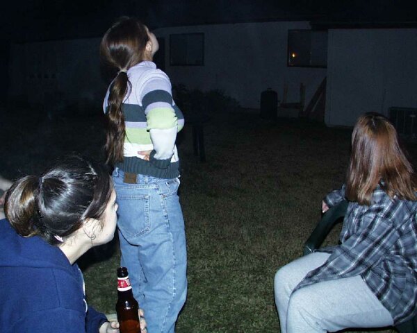 It's a plane! -- From left to right, Leslie Romoli, Leigh Anne Fagin, and Bonnie Ritchey gaze at the sky. Although the photograph doesn't make this apparent, they are observing the moon, which is being covered by the Earth's shadow. Taken outside Aimee's apartment on 1/20/2000 by Carrie M.