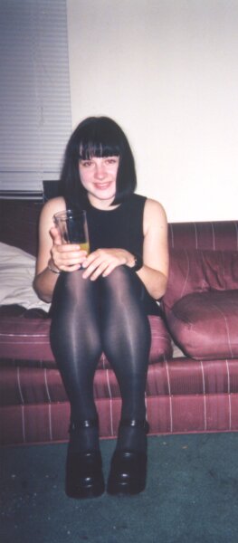 Me on the red couch -- I'm sitting on the red couch, holding a glass. The glass contains a drink called a Blue Canary. It is made with gin, blue curacao, and grapefruit juice. To me, it tasted like orange rind. But it wasn't TOO bad. It was a lovely cloudy blue color. I didn't notice this until after I scanned this photo in, but Rasputin is laying under the table next to the couch. Enjoy that added bonus. Taken in my living room in Austin, January 2000.