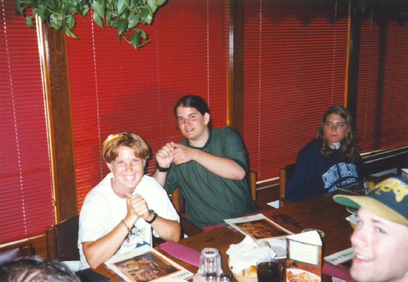 Scarlett and I -- Taken at the Rehearsal Dinner that was held at Olive Garden, Scarlett (my now ex-wife) and I pose for the camera. In the far right is Sharalyn, my brother's then-girlfriend, and in the bottom right-hand corner of the picture is Andy Swan's head
