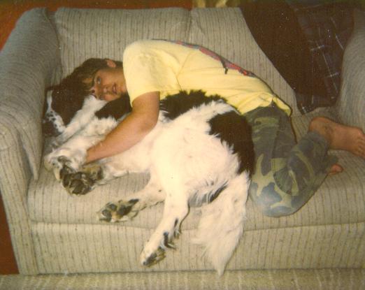 Me and Spud -- I am making sweet love to Spud, a dog (now dead, sadly) belonging to my Uncle Tom. Probably around 1991