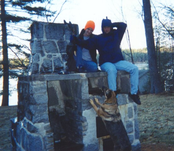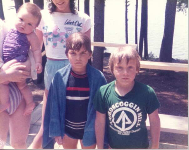 Me, A.J., Brian Dehan and someone else -- Belgrade Lakes, Maine. I am the kid in the party hat (who is eating the string of the hat). The guy with the glasses is A.J.. The stretched-out kid is Brian Dehan. I have no idea who is in the chair