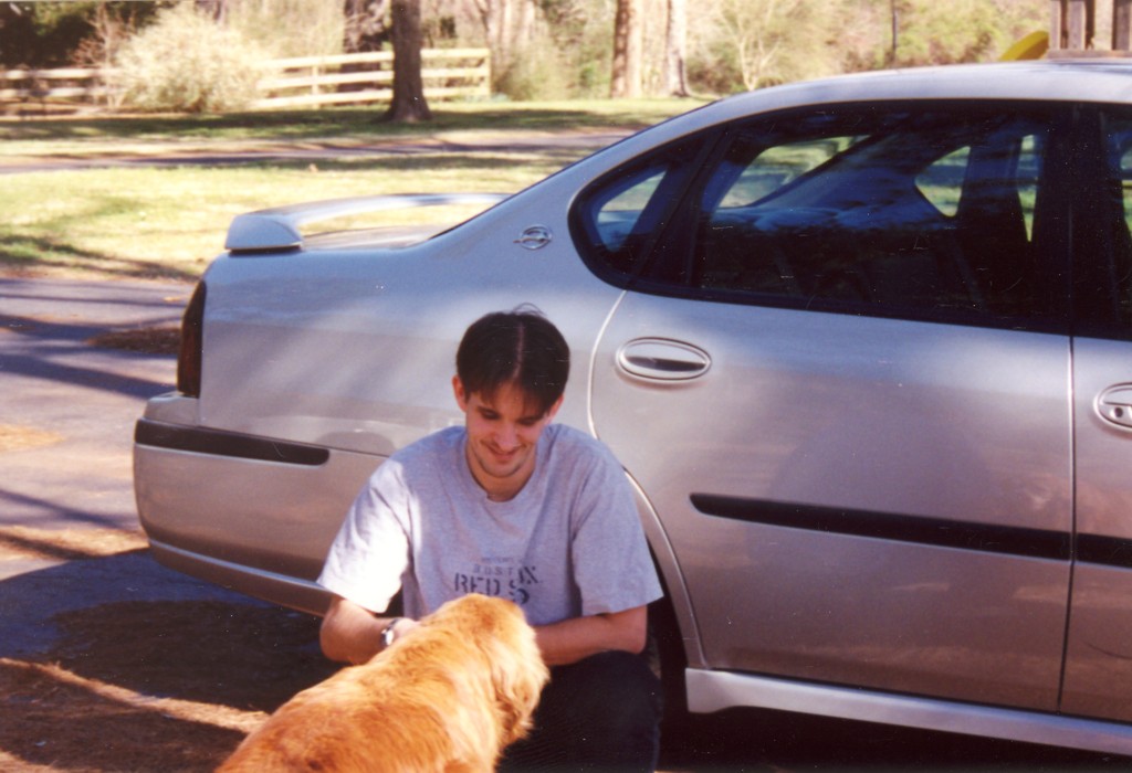 Mitch and his Impala -- On March 10th, 2002, I traded in my trusy 1993 Buick LeSabre for a brash 2001 Chevy Impala. The Buick had served me well for many years, and before that it had served my brother Matt and my father well. However, perhaps in part due to some rough riding and long miles over the years, it eventually had to step aside for its successor. In this picture I am standing in front of the Impala. This is a particularly good picture of the car because you cannot see the silly spoiler on the back end of it. Other than the spoiler, it's a fine car. This picture was taken in Nacogdoches, Texas, at Shannon's house (she's my half-sister). Her husband Jeff's family owns a Chevy dealership, and they gave me a good deal on the car. I think my mom took this picture. She was visiting Shannon at the time of the car breakdown.