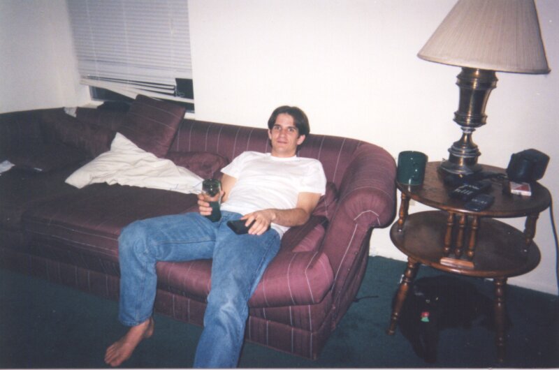 Curtis on the green couch -- Curtis sits on the green couch in my living room in Austin, January 2000. I don't know who took the photo. I don't have much to say about this photo. I will say, however, that Curtis is tall.