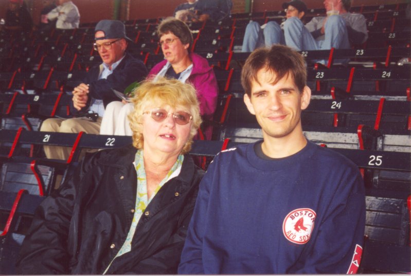 My mother and I -- Sitting in Fenway, with my father taking the picture. You can see a piece of gum in my mother's partially open mouth!