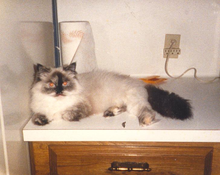 Norman looking over a cliff -- This picture was taken at my parents' house in North Carolina, where Norman the wondercat lays perched on top of a cabinet in the kitchen, looking down for the camera. 1995 or 1996.