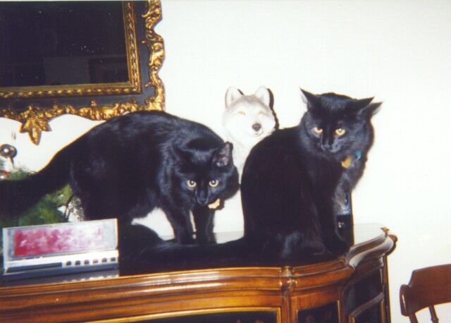 Rasputin and Frankenstein -- Looking back, I see that they had less fur at that age. They look like different cats. I believe Rasputin is on the left and Frankenstein is on the right. This is at my parents' house in Maine. I believe it to have been taken December 1997.